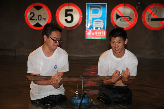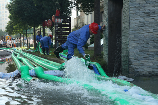 12日早上7时,正在抢险的轨道交通抢险突击队又接到梨洲街道三江口小区抢排“救援”通知。虽然台风已过6天,但当抢险分队队员赶到小区时,只见该小区积水仍有齐腰深,一楼基本被淹。抢险分队立即安装和投入13台200、250毫米直径水泵,开始抢排。