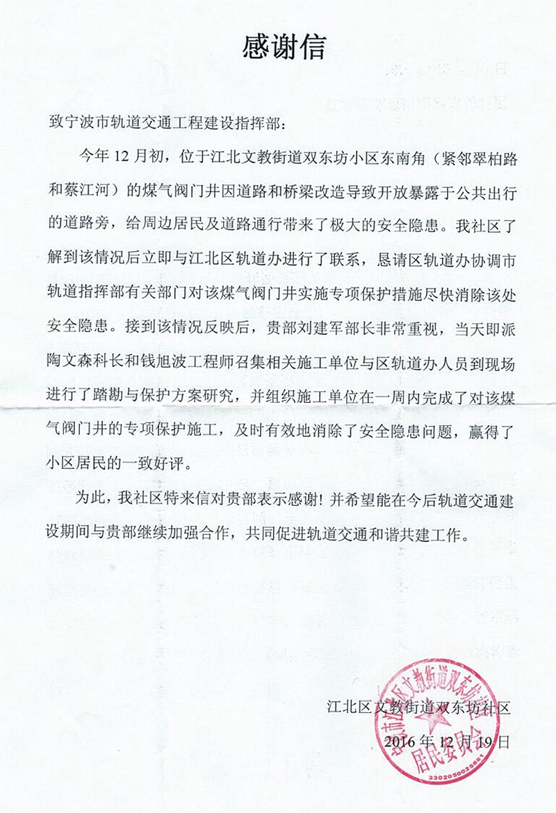 日前,江北区文教街道双东坊社区发来致轨道交通指挥部一封感谢信,感谢指挥部帮助完成小区煤气阀门井的保护施工,及时有效地为居民解决了安全隐患。