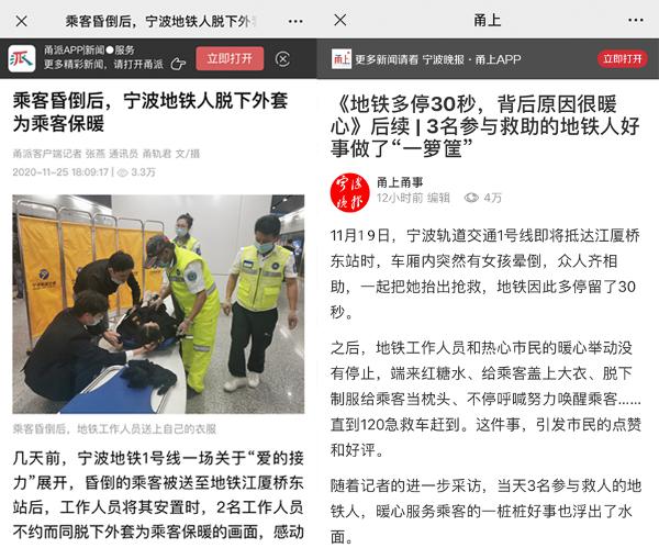 几天前,宁波地铁1号线一场关于“爱的接力”展开,昏倒的乘客被送至地铁江厦桥东站后,工作人员将其安置时,2名工作人员不约而同脱下外套为乘客保暖的画面,感动不少人。