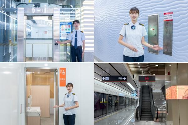 全线车站设有无障碍电梯,出入口、通道、站厅和楼梯均设置盲道。公共区卫生间配置高低洗手台、适应不同身高的儿童与成人需求。车站还设有母婴室,配备婴儿护理台,提供私密且舒适的照护空间。