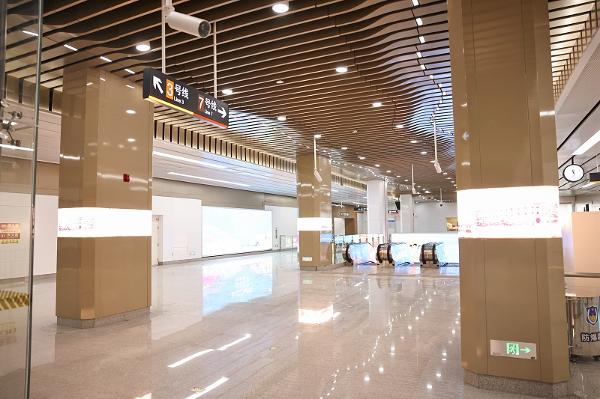 体育馆站是7号线与3号线的换乘站,两线在站厅使用通道换乘。
