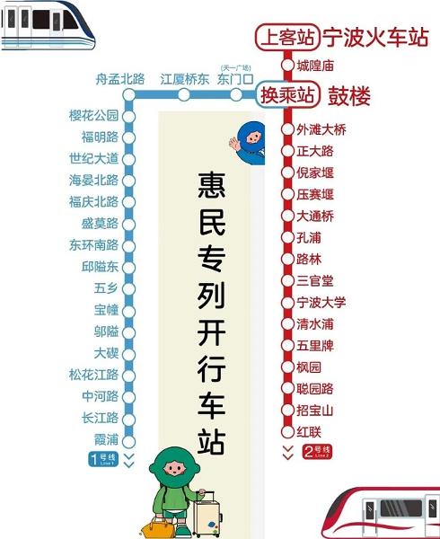 “惠民专列”运行期间,除地铁2号线宁波火车站可进站乘车外,专列开行区段其他各站只出不进。特别提醒,“惠民专列”将依据临客列车开行状况及返甬乘客数量进行适时调整。